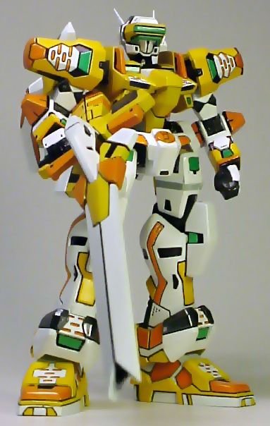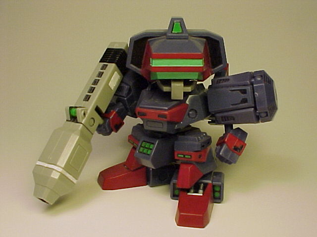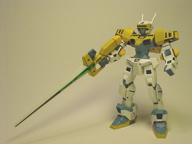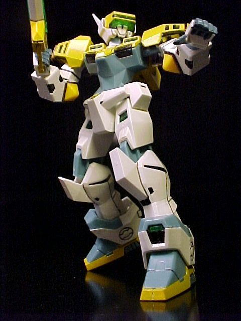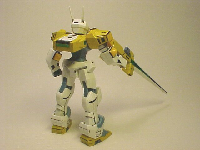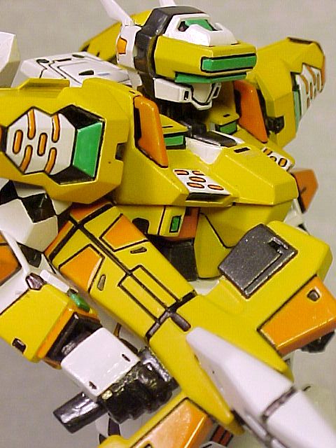 I had very primitive skills then. The parting lines were not treated. The yellow parts were sprayed a few layers with Tamiya's Camel Yellow (Gloss) canned spray paint, which is very close to the original color. The fingers and the grey parts of the launcher and above the visor were brush painted with a mixed water-based paint, unthickened. I used a oil-based sign-pen to color the black parts. A practice type indeed with minimal painting.